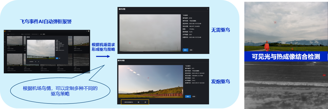 系统通过AI自动化识别与预警播报,实现了从“被动驱赶”到“主动预警、精准防控”的转变。可见光双目相机与红外热成像相机昼夜交替工作,确保24小时全天候智能守护。AI巡查模式大大缓解了工作人员的巡查压力,推动了机场飞鸟巡查工作的智能化、自动化转型。