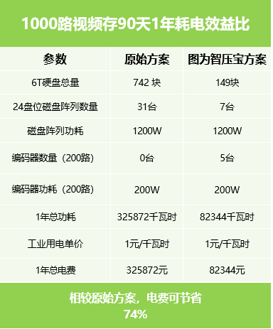 以1000路视频为例,采用图为智压宝方案后,存90天1年耗电量可节省74%左右,存储空间可节省80%左右;而10万T视频存储费用可节省14亿元左右。