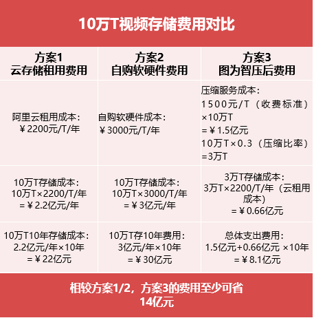 视频数据爆炸式增长,存储开销直线飙升!云存储租用成本高达¥800-1500元/TB/年,自购软硬件需¥3000元/TB/年。一个数据中心的视频动辄上十万T,年存储费用轻松破亿。